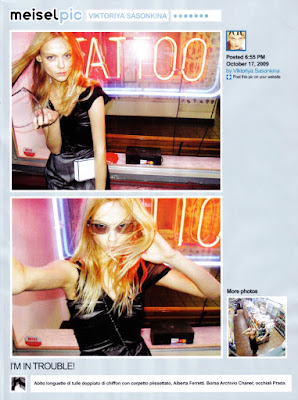 "Meisel co-opted the Twitter phenomenon for the last Vogue Italia issue of the decade — December 2009 — and rechristened Twitpic "Meiselpic" for his purposes. Inside the issue he wrote to his 20 model "followers" under a blurred portrait of himself — surprising, as the photographer is reclusive and does not like to be photographed himself —"Feeling a touch swine flu . . . so not coming to work today. I'm sending you some clothes . . . wear what you like, Meiselpic it back to me. xxSteven." What comes next — "