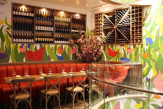 Plush, subtle and with just the right splashes of color, "Euro" meets "Soho" via the new Mediterranean themed Beba. Eyes offset by a whirling backdrop of abstract flowers, the mood sets itself perfect for a contemporary, afternoon lunch. Rose-pedaled lanterns play up a whimsical garden theme, supported by an array of bouquets, fresh sunflowers and rare orchids. Amongst select walls, colorful pigments baptize this South of Houston(Soho) eatery with a crisp and chic atmosphere.