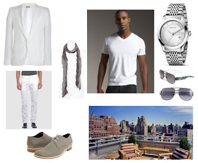 Give yourself a Summer season spruce-up from those average maverick white tee looks. Power yourself with a crisp, clean quintessential persona using an all white, single button sports coat, a Gucci "G-Timeless" stainless steel watch, and a precious pair of leather in-soled Marc Jacobs shoes. A sleek hood boy from 'down the street' high jumps over to the wall street elite.