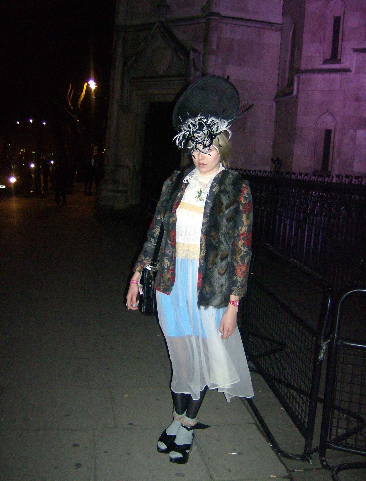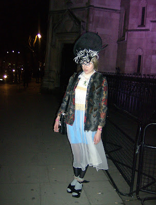 The head peice is dope, the jacket looks expensive, the sheer dress, socks, and shoes--I'm not a fan! I'm always down with mixing the cheap w/ the expensive, but c'mon now. Not in such an obvious, dirty-sock looking way!