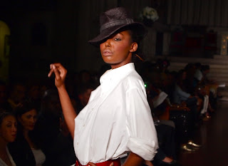 The show was rounded out with an opulent focus on hats by designer Ikasho. Wide brimmed made the biggest impact in new colors such as red red and sky blue (two big hues to look for and pair for Spring.) Craftily set upon the heads of models wearing nothing but simple white Oxford shirts, the audience is probably booking flights to Florida this instant, being unable to wait for 2012 to give those bold looks a real-life try.