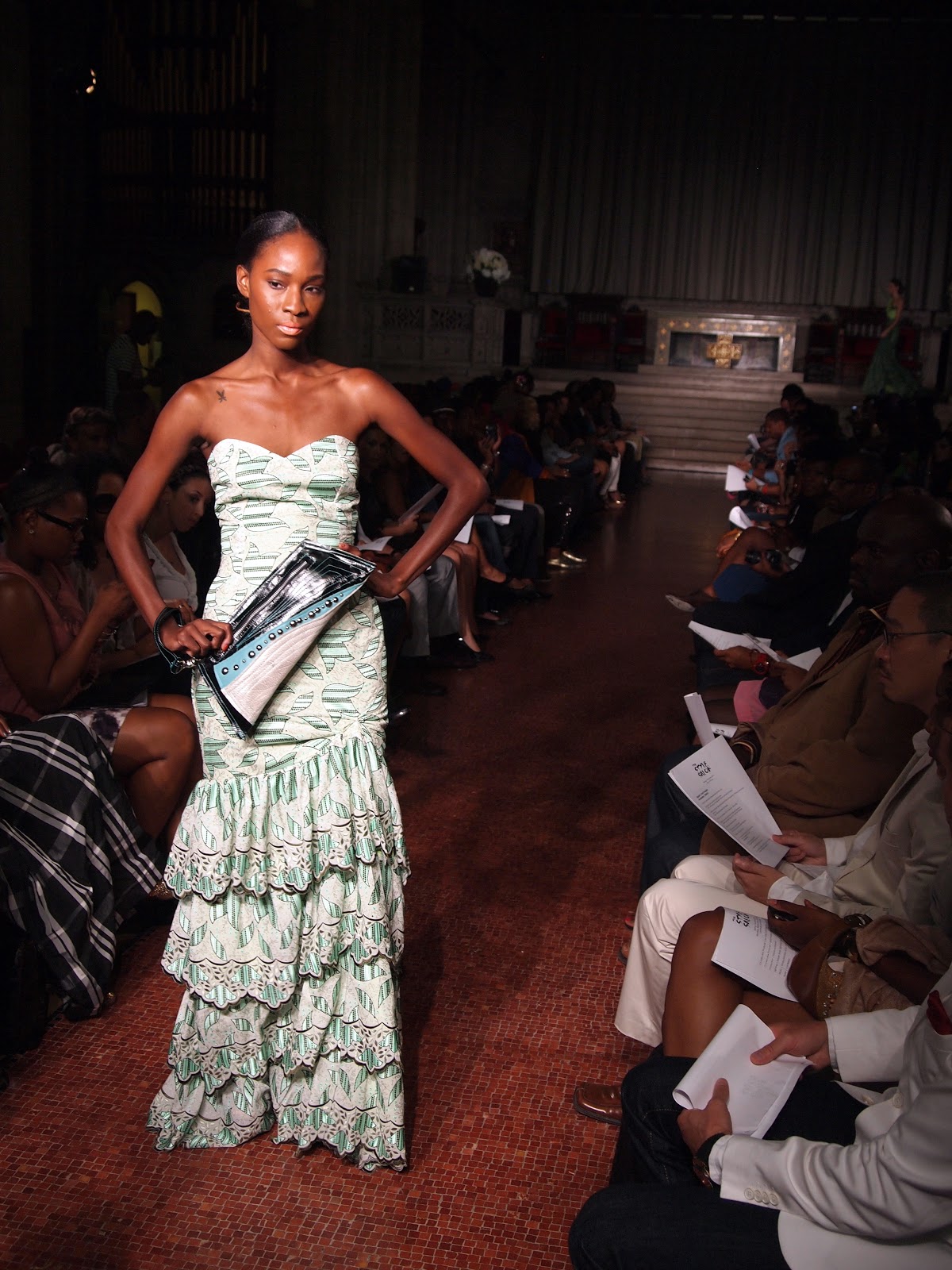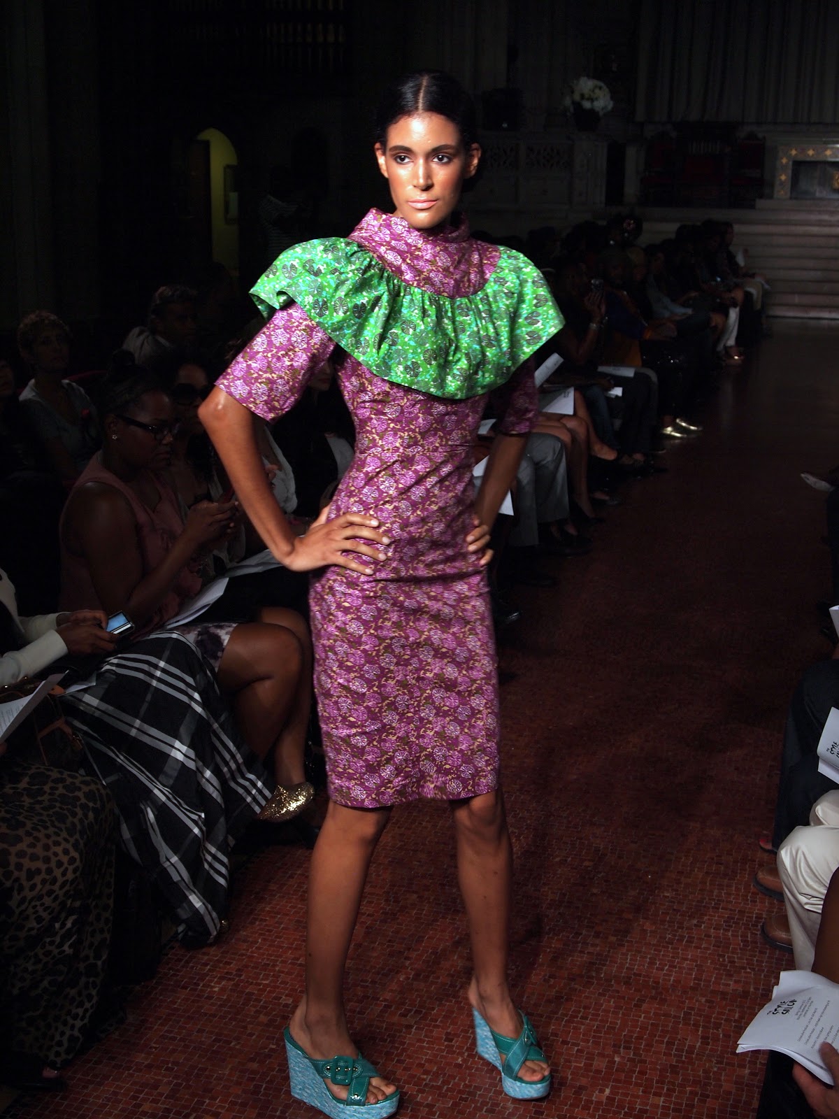 Maria Michele's fresh take on the skin tight and strappy party dress, a look infamously overdone by the Kardashians, had me saying, “Oh yes,” under my breath as I diligently wielded my Olympus at the runway. It was the mixing of fabrics and prints that did it - always a surprise up her sleeve, or in the design’s case, right on it. Gold sequined cap sleeves on a leopard print body and wearable chains dangling from the mostly bare backs make her collection a real head turner.